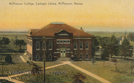 Postcard of Carnegie Library at McPherson College at McPherson, Kansas.