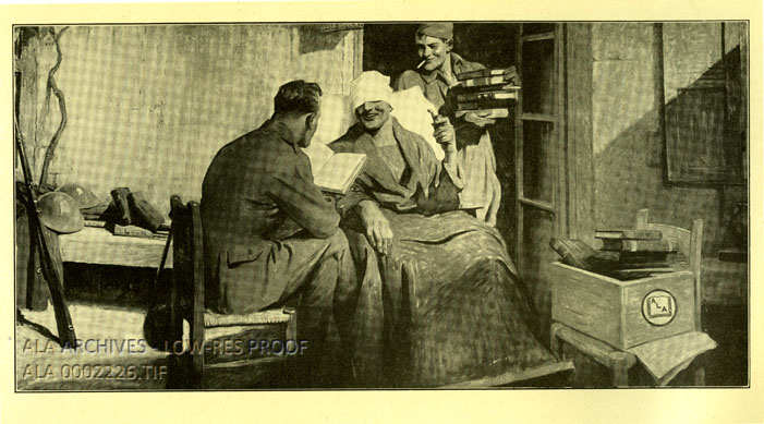 Painting of a man reading to a blinded soldier during World War I by Denman Fink, commissioned by the ALA for the United War Work Campaign in 1919.