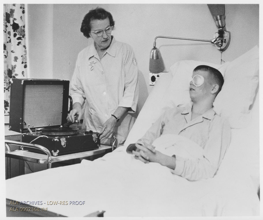 A patient with an eyepatch listening to an audio recording of a book on a record.