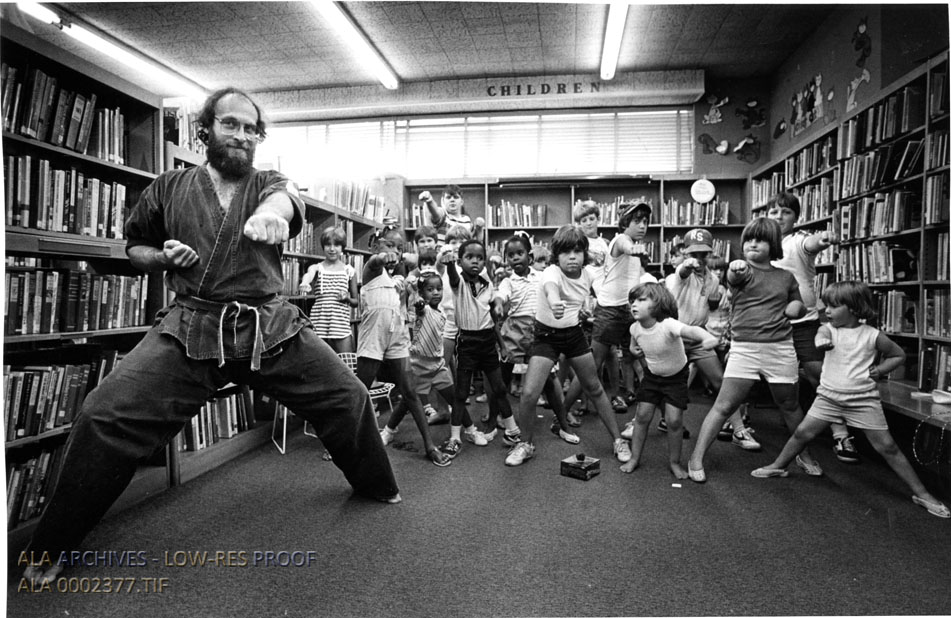 Bill Stockey, director of the Hilliard branch of the Chesapeake Public Library in Virginia, teaches youngsters the basic horse stance and the blow that goes with it during a South Norfolk branch program.