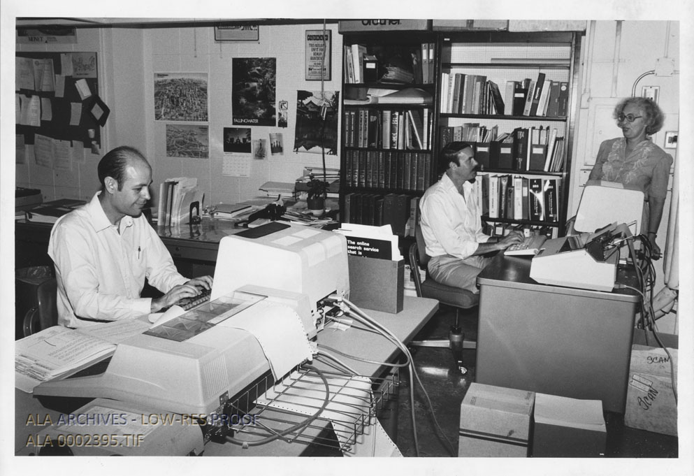 Left to right, Gordon Brooks (Social Sciences Subject Specialist), David Gonnella (Library Assistant), and Evelyn Greenwald (Director), working at the South California Answering Network at the Los Angeles Public Library.