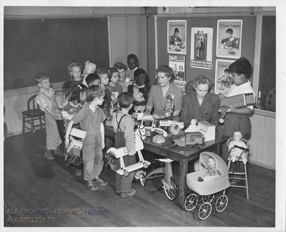 Caption Reads: Toy-lending library at Washington School, Minneapolis, under auspices of Minneapolis Public Library. "Toyrarians" are volunteer workers.