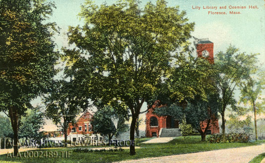 Postcard of the Lilly Library and Cosmian Hall in Florence, Massachusetts.