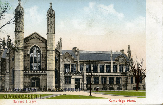Postcard of the Harvard Library in Cambridge, Massachusetts.