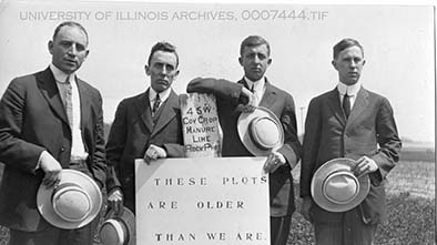 Photo of four young men in Morrow Plots (from left to right: Harry B. Piper, Robert Heghauer, Walter S. Hatch, Charles L. Porter) holding a sign that reads, 'These Plots are Older Than We Are."