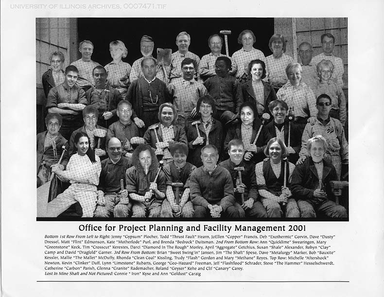 Group photograph of the employees of the Office for Project Planning and Facillity Management. Photograph has been digitally altered to add mining hammers and shovels. Name list of employees shown is included below the photo.