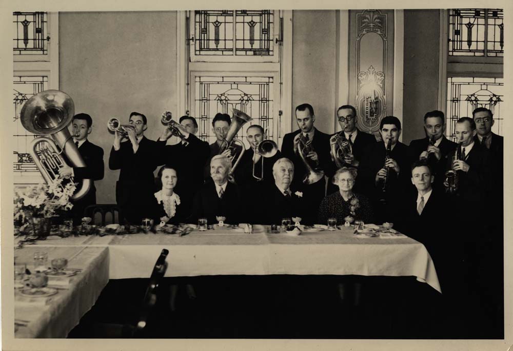 Former Members of the Wallace Ewing Band and Members of the WDWS German Band Performing at the Golden Wedding Anniversary of Rosetta and Wallace Ewing at the Inman Hotel in Champaign, Illinois. Portrayed in the Photograph: seated at the table, left to right: Mrs. William Banielson (youngest daughter of Mr. Ewing), Elmer C. Ewing (Mr. Ewing's Brother), Mr. Wallace Ewing, Mrs. Rosetta Ewing, and E.O. Ewing (Youngest Son of Mr. Ewing); the band members left to right: Jack Ewing, Charles Livingston, Russell Wilson, Driver Lindsey, Dwight Bell, Millard Osborne, Clinton Osborne, Leonard Hays, Richard Michael, James L. Benefiel, and Lyle Blue. Photographed by Joe Blessman.