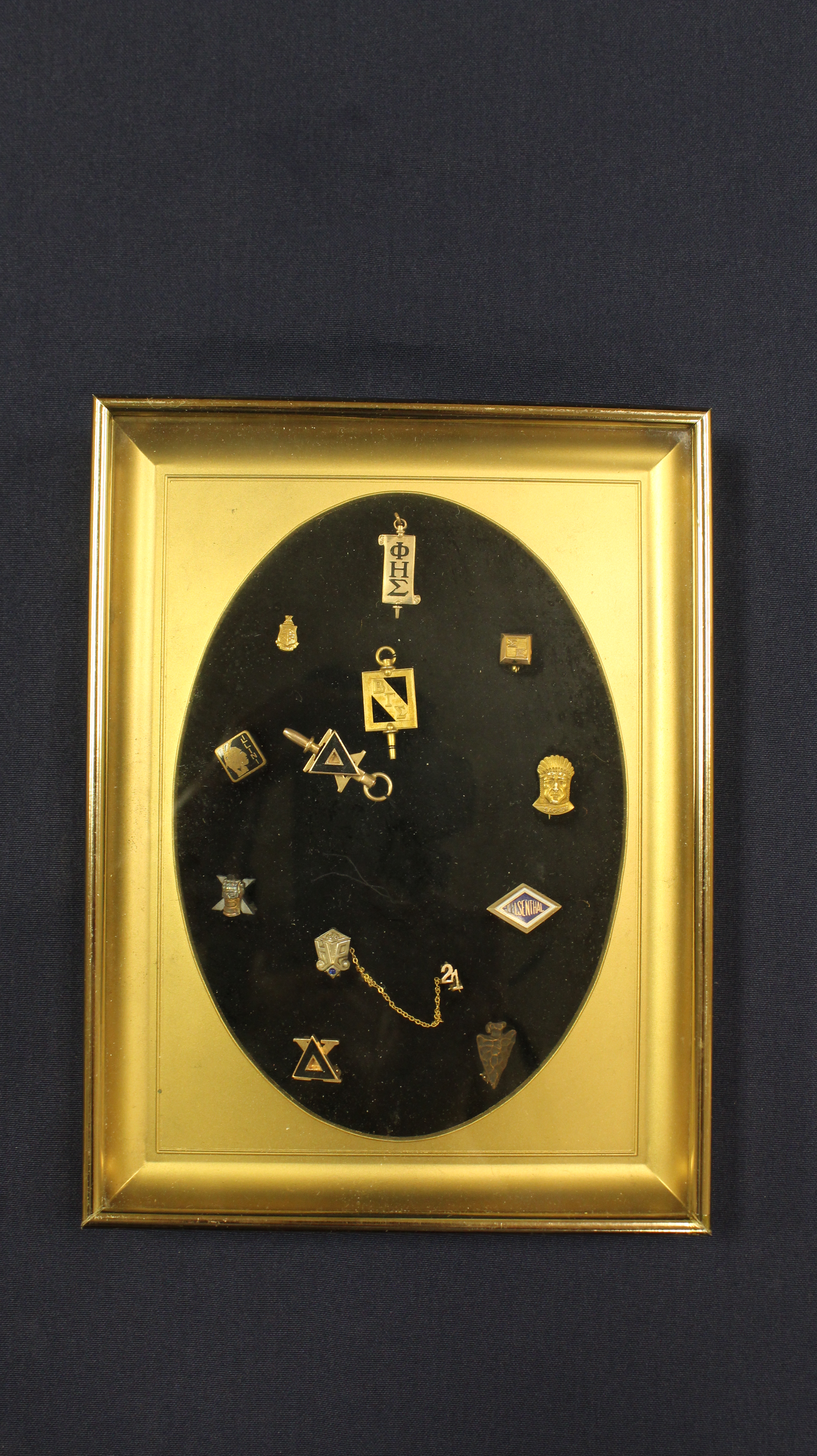 This collection of pins belonged to Verne Leslie Hahneman. They are displayed in a gold frame. The pins are from student organizations and grade/high school, including Sachem, Ma-Wan-Da, Signma Epsilon, Phi Eta Sigma, Beta Gamma Sigma, Delta Chi, David of X, Hyde Park High School, and Felsenthal Grade School.