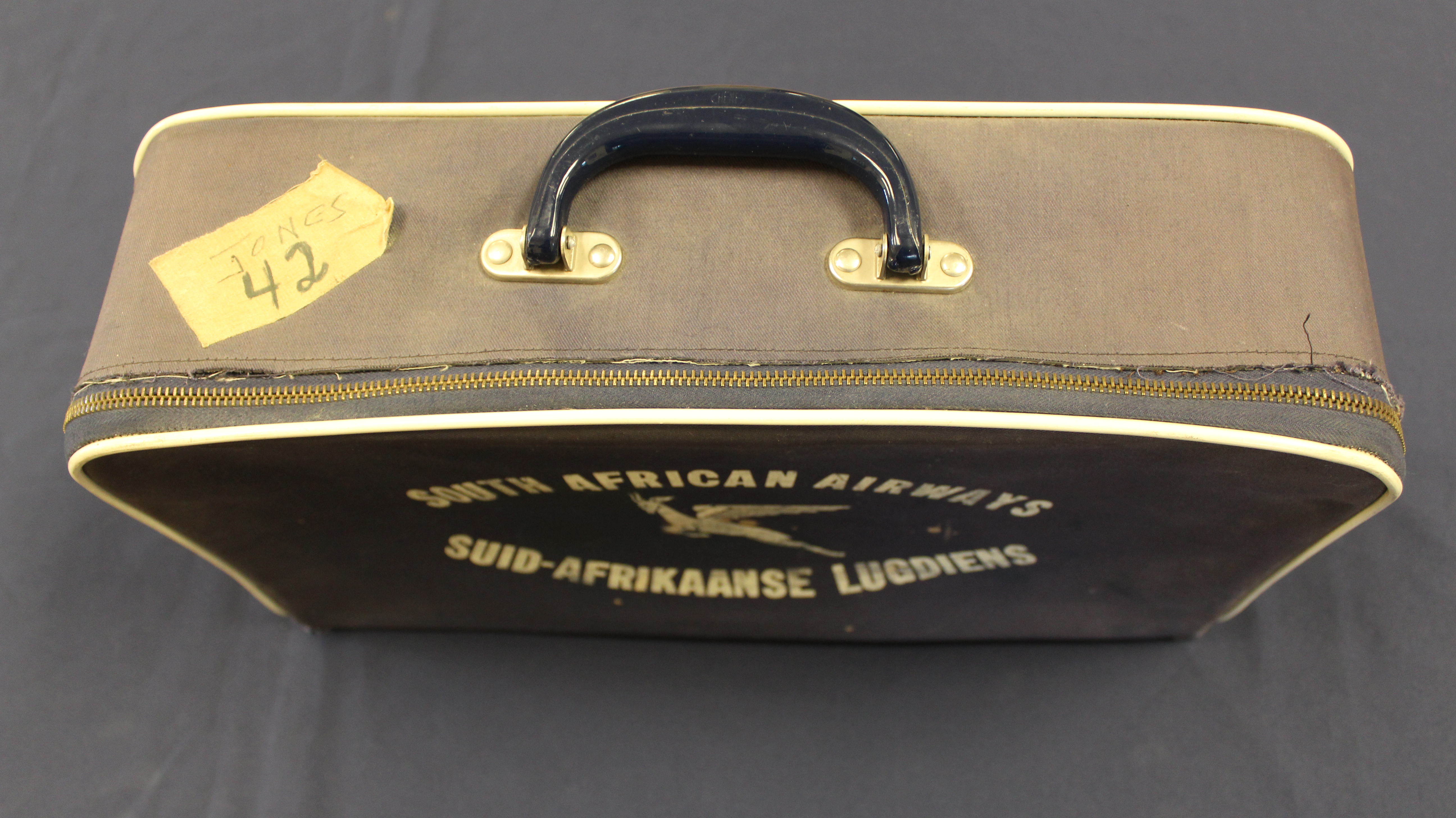 This small, navy suitcase reads "South African Airways Suid Afrikaanse Lugdiens". A patch near the handle reads "Jones 42". It relates to the 1962 Wheelchair Athlete Tour of the Republic of South Africa and the Federation of Rhodesia and Nsayaland. From the Tom Jones Papers record series 41/20/262.