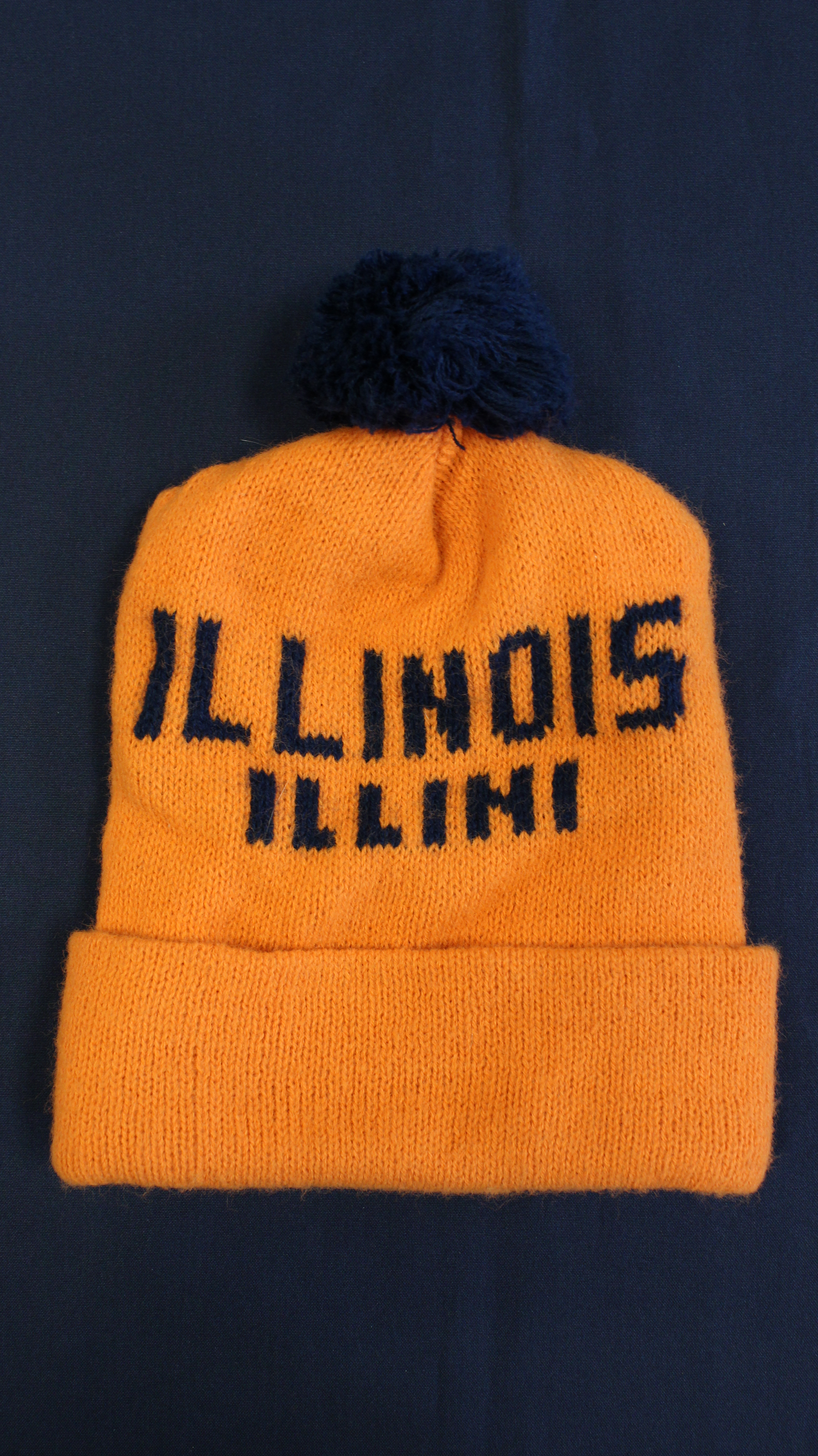 This orange winter hat reads "Illinois Illini" in blue on the front and the back. It is topped with a blue pom pom.