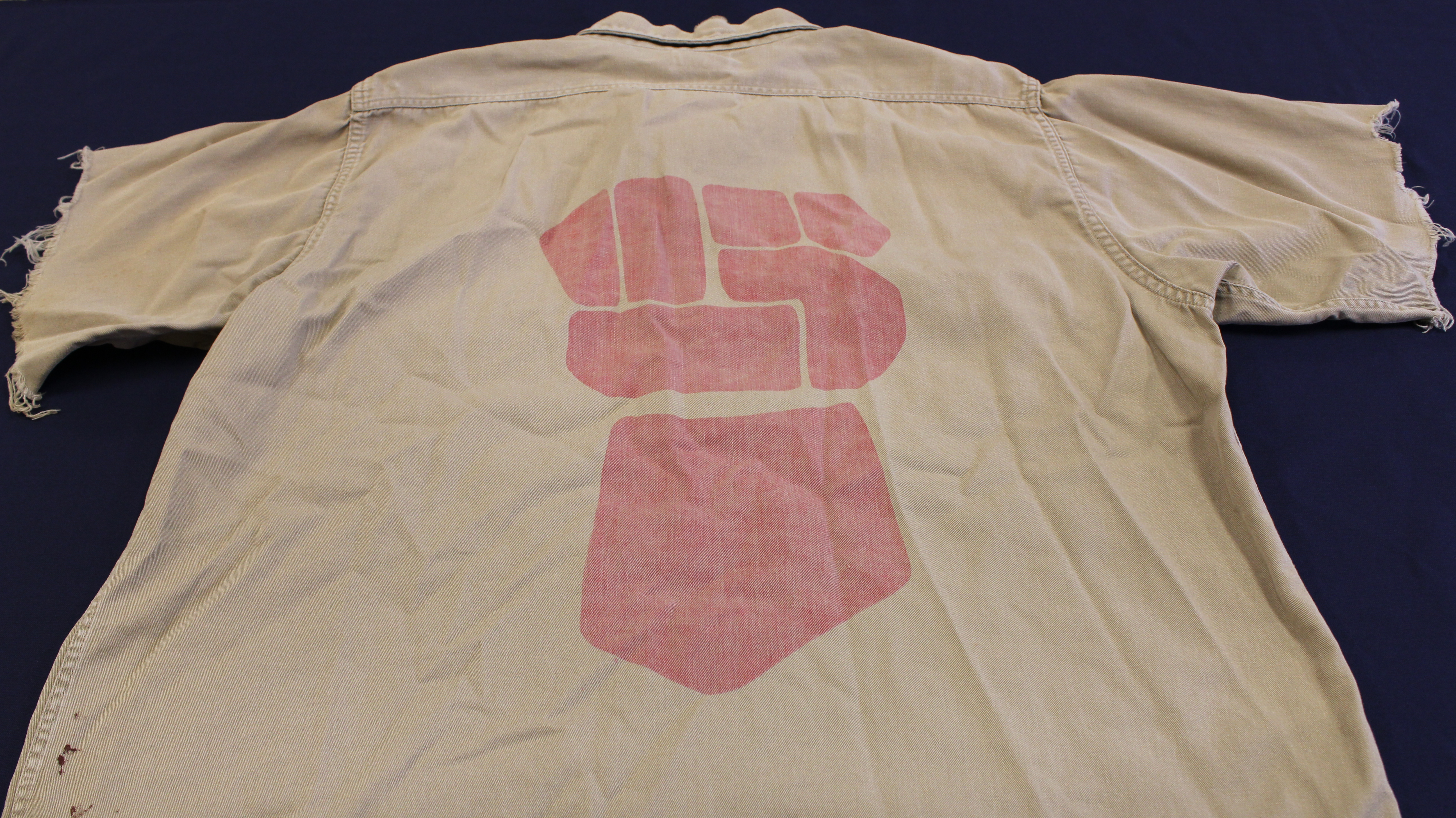Artifact 595: Anti-War Shirt with Red Clenched Fist | University of Illinois Archives