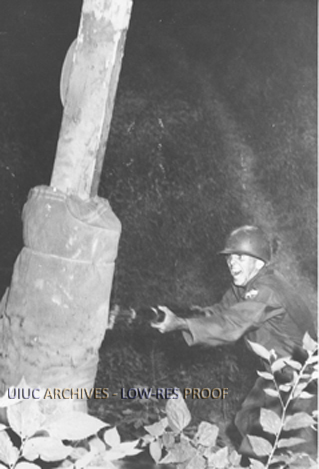 Caption on back: Cadet Thomas Henwood of the University of Illinois, Champaign, Illinois is shown making an assault on a make-believe enemy. This action photograph was taken on the bayonet and assault course recently at the Fort Riley ROTC Summer Camp.