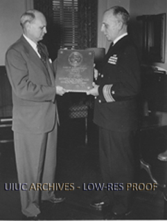 Caption on back reads, "Plaque honoring U. of Ill. for wartime activities in training Navy personnel presented by Rear Adm. J. Cary Jones, Com. 9th Naval Dist., to Pres. Stoddard.  Univ. established NROTC, V-12 officer training, V-12 medical officer training, and provided facilities and co-operated instruction for Naval Training School for visual signalmen, diesel experts, cooks and bakers, engineers, and amphibious firemen."