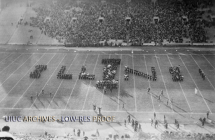 The famous U. of I. concert band, marching in formation, spelling "ILLINI." "Chief Illiniwek" is visible on field.