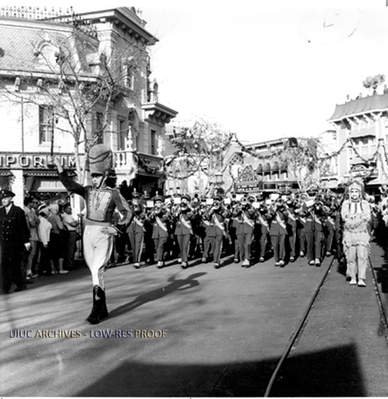 Drum Major and "Chief Illiniwek" leading band through streets of Disneyland.