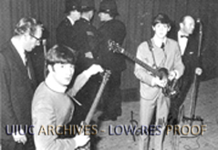 The Beatles on stage before/after performance. Lennon tunes up, McCartney plugs in. Scotland Yard officers in the background. Signed by Paul McCartney.