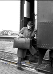 Harmon (in mustache disguise) jumping on/off railroad car.