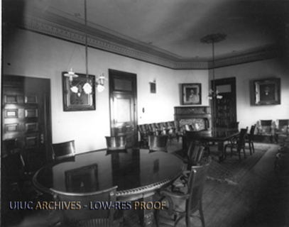 View of Trustees Meeting Room inside Altgeld Hall when it was the library, with large tables, fireplace, and portraits visible.