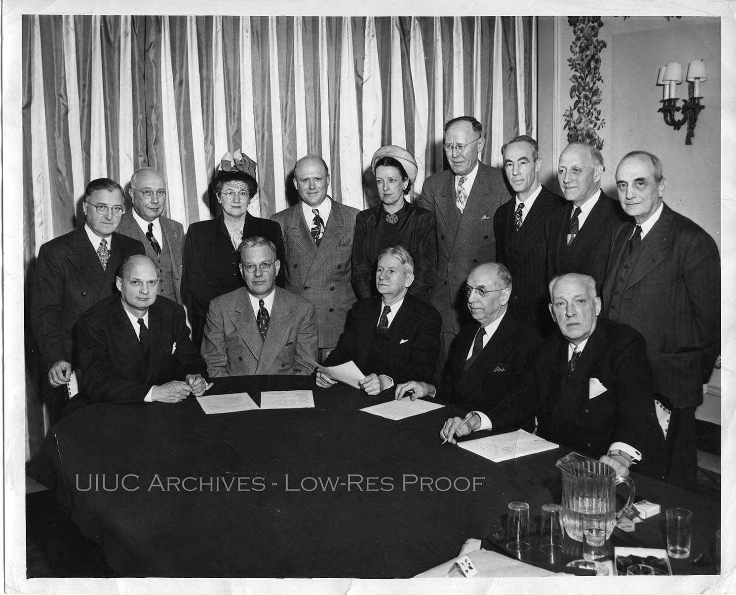 Caption on back reads: "ANNUAL MEETING OF BOARD OF TRUSTEES, UNIVERSITY OF ILLINOIS, MARCH 8, 1949. Standing left to right: Dr. Karl A. Meyer, Mr. John R. Fornof, Mrs. Doris S. Holt, Mr. Park Livingston, Mrs. Frances B. Watkins, Superintendent Vernon L. Nickell (Public Instruction), Mr. Robert Z. Hickman, Mr. Walter W. McLaughlin, Mr. Wirt Herrick. Seated left to right: President George D. Stoddard, Mr. Kenney E. Williamson (President of the Board), Mr. H. E. Cunningham (Secretary of the Board), Comptroller Lloyd Morey, and Treasurer Irvin L. Porter."