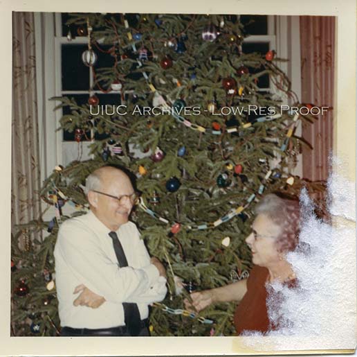 Former University of Illinois president George D. Stoddard and his wife, Margaret, stand in front of a Christmas tree.