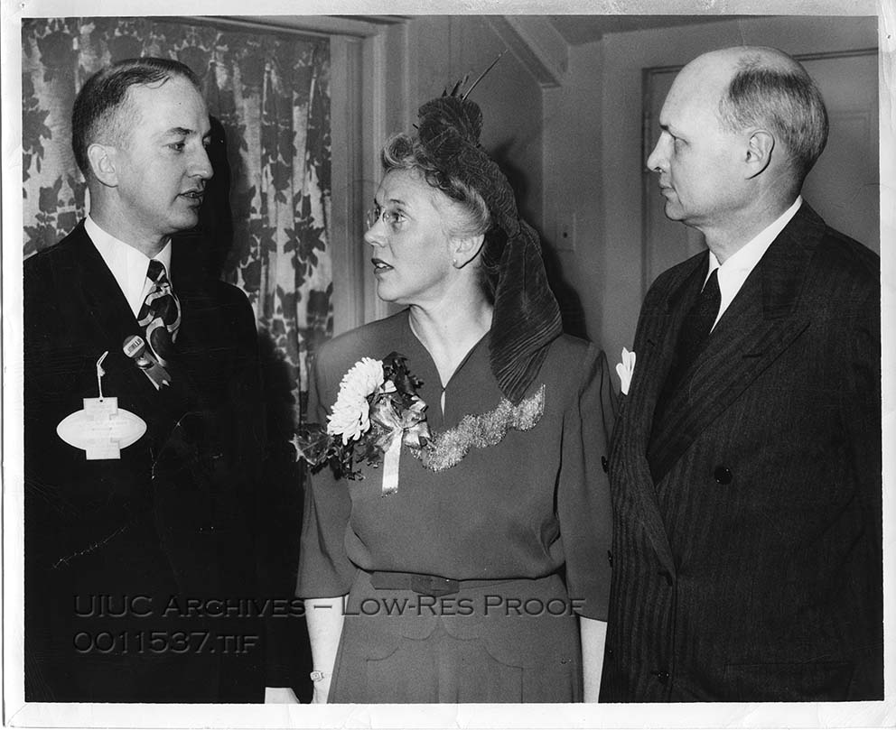 University of Illinois President George D. Stoddard (right) and his wife Margaret (center) speak with an Illinois alumnus. Note on back reads: "NY Army Game alum reception October 1947." See also 0011548 with moderately different biographical information provided.