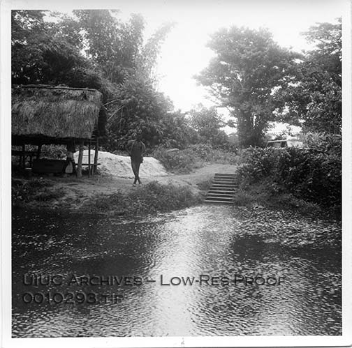 A man stands on a riverbank near a landing. Note on back reads: "landing Njala oil palm station NUC. 8/66" [NUC stands for Njala University College, a university in Sierra Leone.]