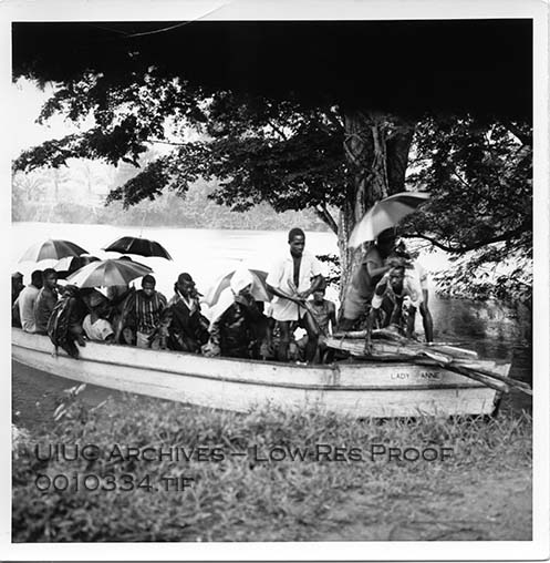 A group of people with umbrellas sits in a boat painted with the name "Lady Anne." The boat is either launching from or landing on a riverbank near Njala University in Sierra Leone.