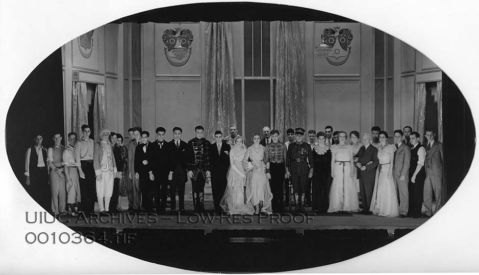 The cast of the play The Queen's Husband (by Robert E. Sherwood) poses on stage.