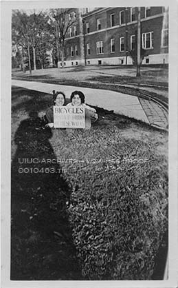 Two students lie in the grass on the Main Quad, holding a sign that reads "Bicycles Positively Forbidden on These Walks."