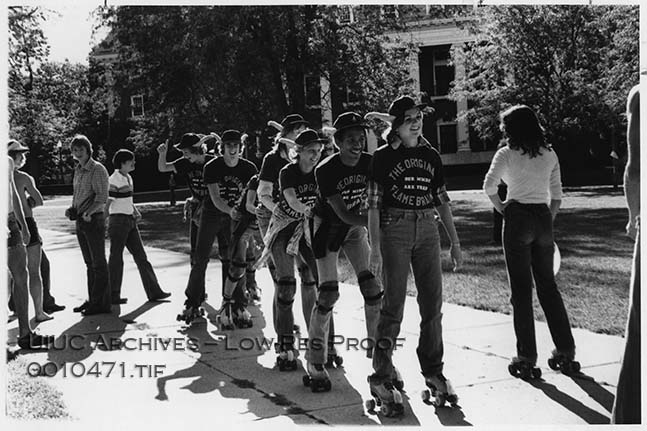 Students wearing "The Original Flame Brains" shirts roller-skate in a conga line on the Main Quad, in an anti-draft "skate-a-thon."