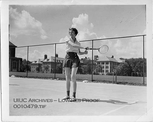 Ruth Von Grueningen swings a racket on the women's tennis courts.