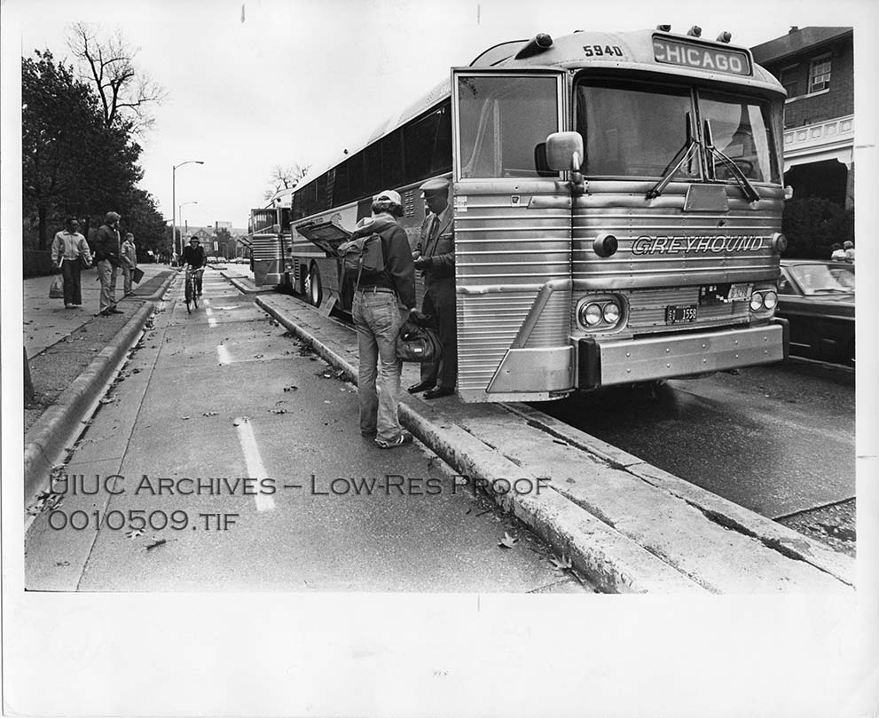 A student speaks with the driver and prepares to board a Chicago-bound Greyhound bus on Wright Street.