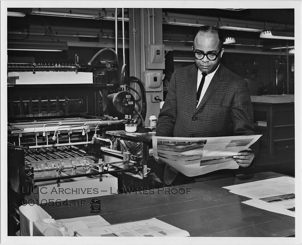 Caption on back reads: "Art Editor Herbert Sterrett of the University of Illinois Press is shown checking proof of a design. Sterrett heads the art department of the Press which has won 34 awards in the past 7 years."