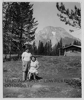 Two women (Helena Tykociner at left) pose in a meadow with a cabin and a mountain in the background.