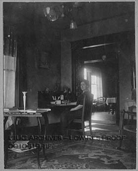 Helena Tykociner sits at a desk in the Tykociner home (noted on reverse as 909 W California St., Urbana, Ill.).