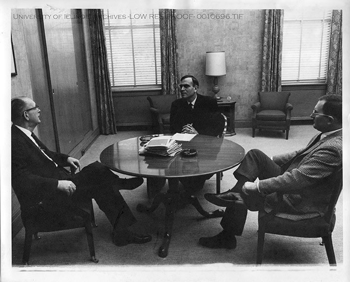 University of Illinois President David D. Henry (left) confers with D.P. Singh (center) and Thomas McCowen (right), the Director of the Office of Overseas Projects.