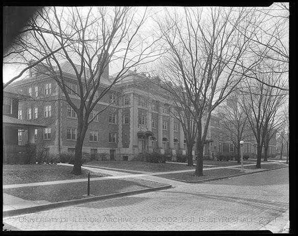 Image depicts the Busey Residence Hall, formerly known as the Womens Residence Hall. Named residence hall by the former President Edmund J. James, the hall was built in 1917 and was both the first womens dormitory, and the first dormitory in general, on campus. Designed in a Georgian Revival style (note the columns, symmetrical limestone facades, and Palladian windows that typified many buildings on campus) by campus planners Charles Platt and James White. In the background of the image is Laura B. Evans Hall, formerly known as West Hall. Busey Hall remains a womens only dorm on campus, yet Evans Hall has become mens only. The building can be located at 1111 W. Nevada Street, Urbana, Illinois