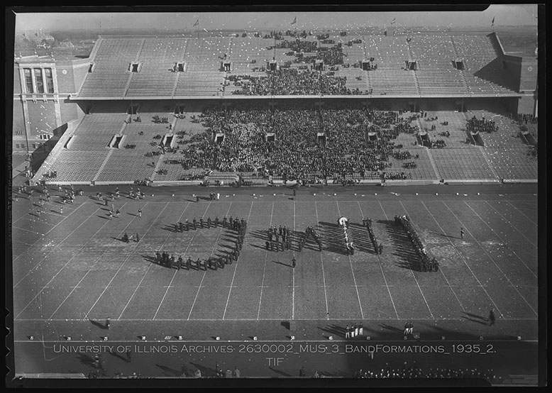The University Band is assembled in the phrase "ILL vs C" for the Illinois versus Chicago game on November 23rd, 1935.