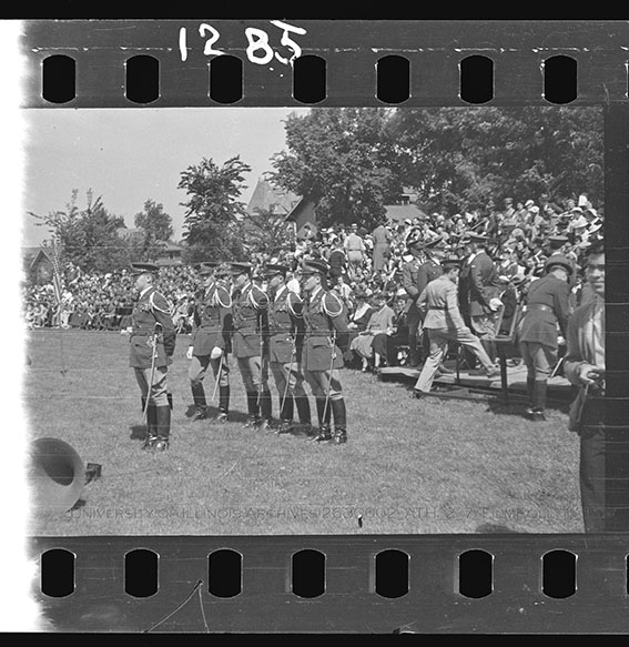 Second Lieutenants assemble in front of the judging platform at the annual Military Day Showcase. The five Men featured here are the executive board of the Scabbard and Blade Military Honors Society. The leftmost offset student is Phil Talbot, the student colonel of the year. Due to the volatile nature of Nitrate Film, digital file can be found at: https://medusa.library.illinois.edu/cfs_files/54134226