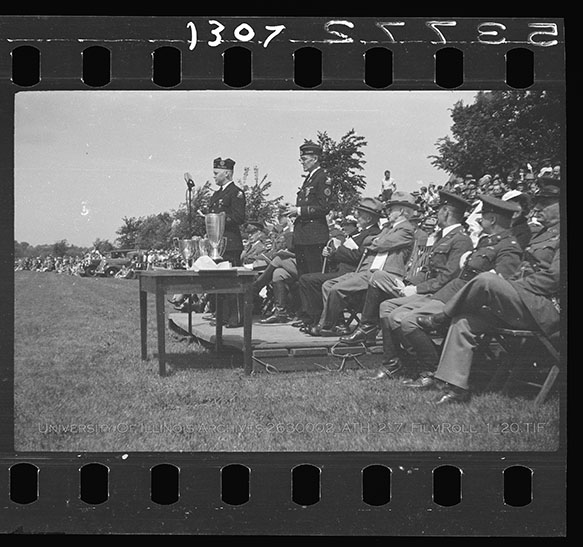 The Military Day Review Committee is seated at the Military Day presentation while two unidentified veterans speak to the assembled ROTC students. Due to the volatile nature of Nitrate Film, digital file can be found at: https://medusa.library.illinois.edu/cfs_files/54134268