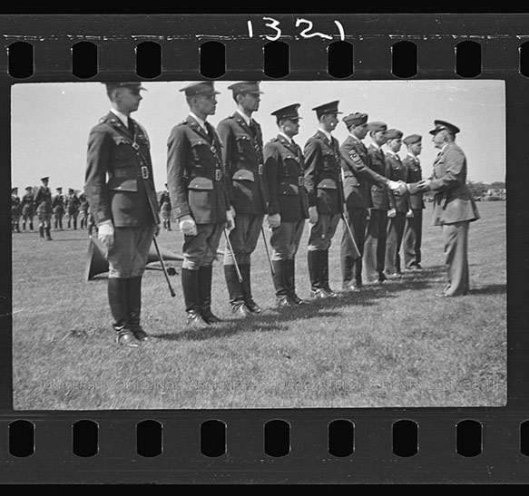 Student soldiers are assembled for the presentation of honors from the Military Day Review Committee Members (right) Due to the volatile nature of Nitrate Film, digital file can be found at: https://medusa.library.illinois.edu/cfs_files/54134306
