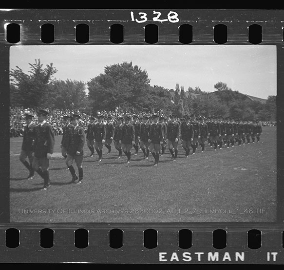 Undergraduate members of the different branches of the military at the University of Illinois assemble in rank for the annual Military Day on the Military Field just south of Memorial Stadium. Military Day was a showcase for the Reserve Officer Training Corps members (ROTC), Infantry, Cavalry, Field Artillery, Coast Artillery, Engineers, and Signal Corps to the university administration and military leaders. In this series of images, the Infantry, Signal Corps, and Cavalry are shown processing in a military parade around the Military Field. Due to the volatile nature of Nitrate Film, digital file can be found at: https://medusa.library.illinois.edu/cfs_files/54134324