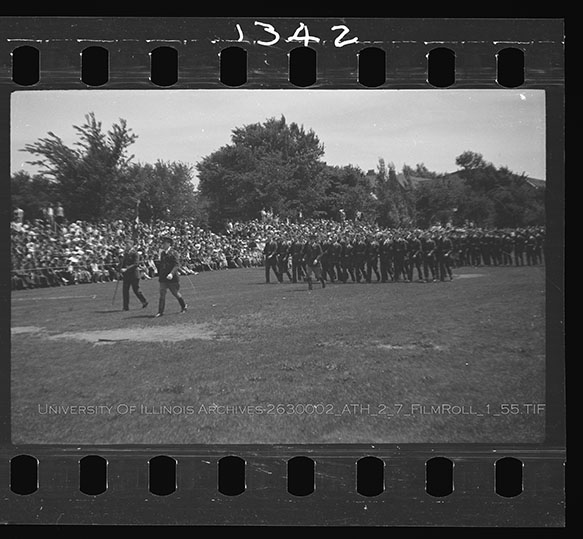 Undergraduate members of the different branches of the military at the University of Illinois assemble in rank for the annual Military Day on the Military Field just south of Memorial Stadium. Military Day was a showcase for the Reserve Officer Training Corps members (ROTC), Infantry, Cavalry, Field Artillery, Coast Artillery, Engineers, and Signal Corps to the university administration and military leaders. In this series of images, the Infantry, Signal Corps, and Cavalry are shown processing in a military parade around the Military Field. Due to the volatile nature of Nitrate Film, digital file can be found at: https://medusa.library.illinois.edu/cfs_files/54134344