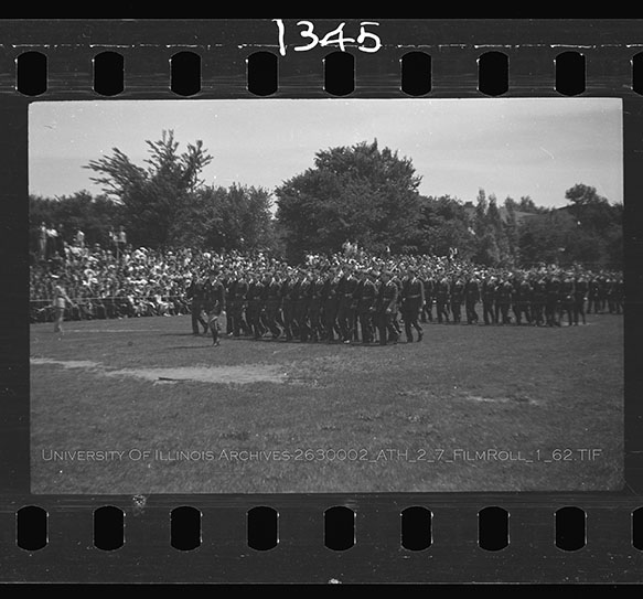 Undergraduate members of the different branches of the military at the University of Illinois assemble in rank for the annual Military Day on the Military Field just south of Memorial Stadium. Military Day was a showcase for the Reserve Officer Training Corps members (ROTC), Infantry, Cavalry, Field Artillery, Coast Artillery, Engineers, and Signal Corps to the university administration and military leaders. In this series of images, the Infantry, Signal Corps, and Cavalry are shown processing in a military parade around the Military Field. Due to the volatile nature of Nitrate Film, digital file can be found at: https://medusa.library.illinois.edu/cfs_files/54134360