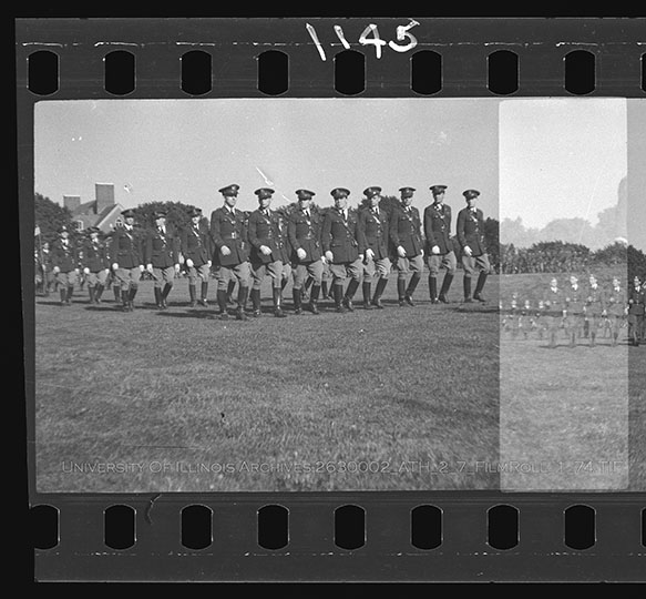 Undergraduate members of the different branches of the military at the University of Illinois assemble in rank for the annual Military Day on the Military Field just south of Memorial Stadium. Military Day was a showcase for the Reserve Officer Training Corps members (ROTC), Infantry, Cavalry, Field Artillery, Coast Artillery, Engineers, and Signal Corps to the university administration and military leaders. In this series of images, the Infantry, Signal Corps, and Cavalry are shown processing in a military parade around the Military Field. Due to the volatile nature of Nitrate Film, digital file can be found at: https://medusa.library.illinois.edu/cfs_files/54134386