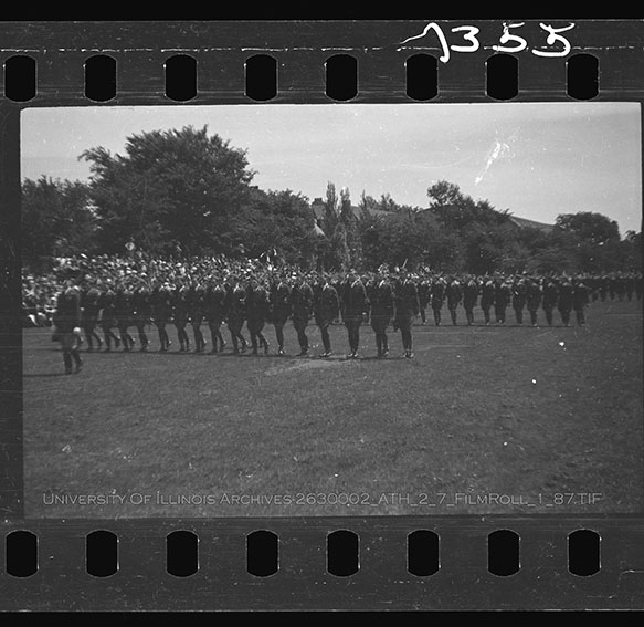 Undergraduate members of the different branches of the military at the University of Illinois assemble in rank for the annual Military Day on the Military Field just south of Memorial Stadium. Military Day was a showcase for the Reserve Officer Training Corps members (ROTC), Infantry, Cavalry, Field Artillery, Coast Artillery, Engineers, and Signal Corps to the university administration and military leaders. In this series of images, the Infantry, Signal Corps, and Cavalry are shown processing in a military parade around the Military Field. Due to the volatile nature of Nitrate Film, digital file can be found at: https://medusa.library.illinois.edu/cfs_files/54134414
