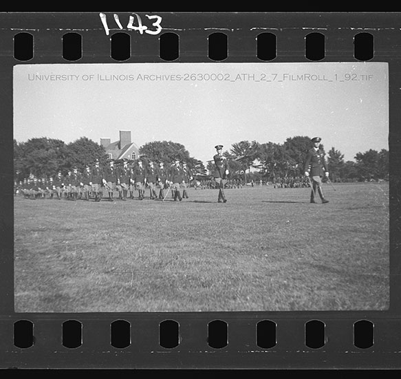 Undergraduate members of the different branches of the military at the University of Illinois assemble in rank for the annual Military Day on the Military Field just south of Memorial Stadium. Military Day was a showcase for the Reserve Officer Training Corps members (ROTC), Infantry, Cavalry, Field Artillery, Coast Artillery, Engineers, and Signal Corps to the university administration and military leaders. In this series of images, the Infantry, Signal Corps, and Cavalry are shown processing in a military parade around the Military Field. Due to the volatile nature of Nitrate Film, digital file can be found at: https://medusa.library.illinois.edu/cfs_files/54134426