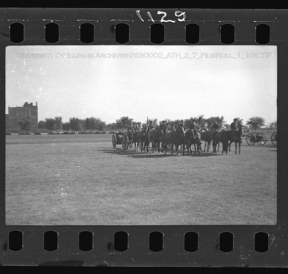 Undergraduate members of the different branches of the military at the University of Illinois assemble in rank for the annual Military Day on the Military Field just south of Memorial Stadium. Military Day was a showcase for the Reserve Officer Training Corps members (ROTC), Infantry, Cavalry, Field Artillery, Coast Artillery, Engineers, and Signal Corps to the university administration and military leaders. In this series of images, the Infantry, Signal Corps, and Cavalry are shown processing in a military parade around the Military Field. Due to the volatile nature of Nitrate Film, digital file can be found at: https://medusa.library.illinois.edu/cfs_files/54134242