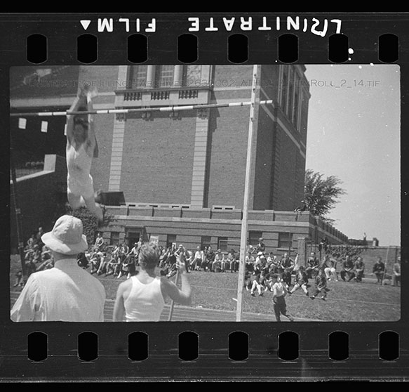 Illinois High School students participate in track and field events at the Interscholastic Track Meet in May 1936. This two-day event, held May 15th and 16th, brought over 600 students from across the state to compete in Memorial Stadium in this pre-cursor to the IHSA State Meet. This image features a student doing the high jump in the south end of the stadium while spotters look on. Due to the volatile nature of Nitrate Film, digital file can be found at: https://medusa.library.illinois.edu/cfs_files/54134452