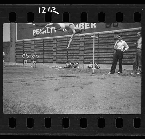 Illinois High School students participate in track and field events at the Interscholastic Track Meet in May 1936. This two-day event, held May 15th and 16th, brought over 600 students from across the state to compete in Memorial Stadium in this pre-cursor to the IHSA State Meet. This image features a student doing the high jump in the south end of the stadium while spotters look on. Due to the volatile nature of Nitrate Film, digital file can be found at: https://medusa.library.illinois.edu/cfs_files/54134462